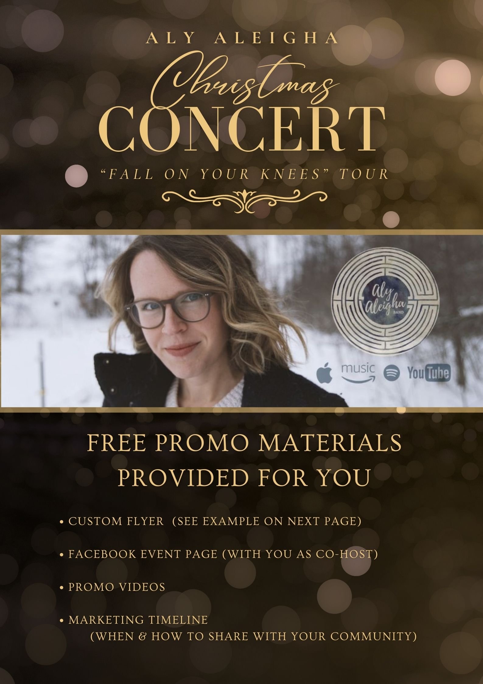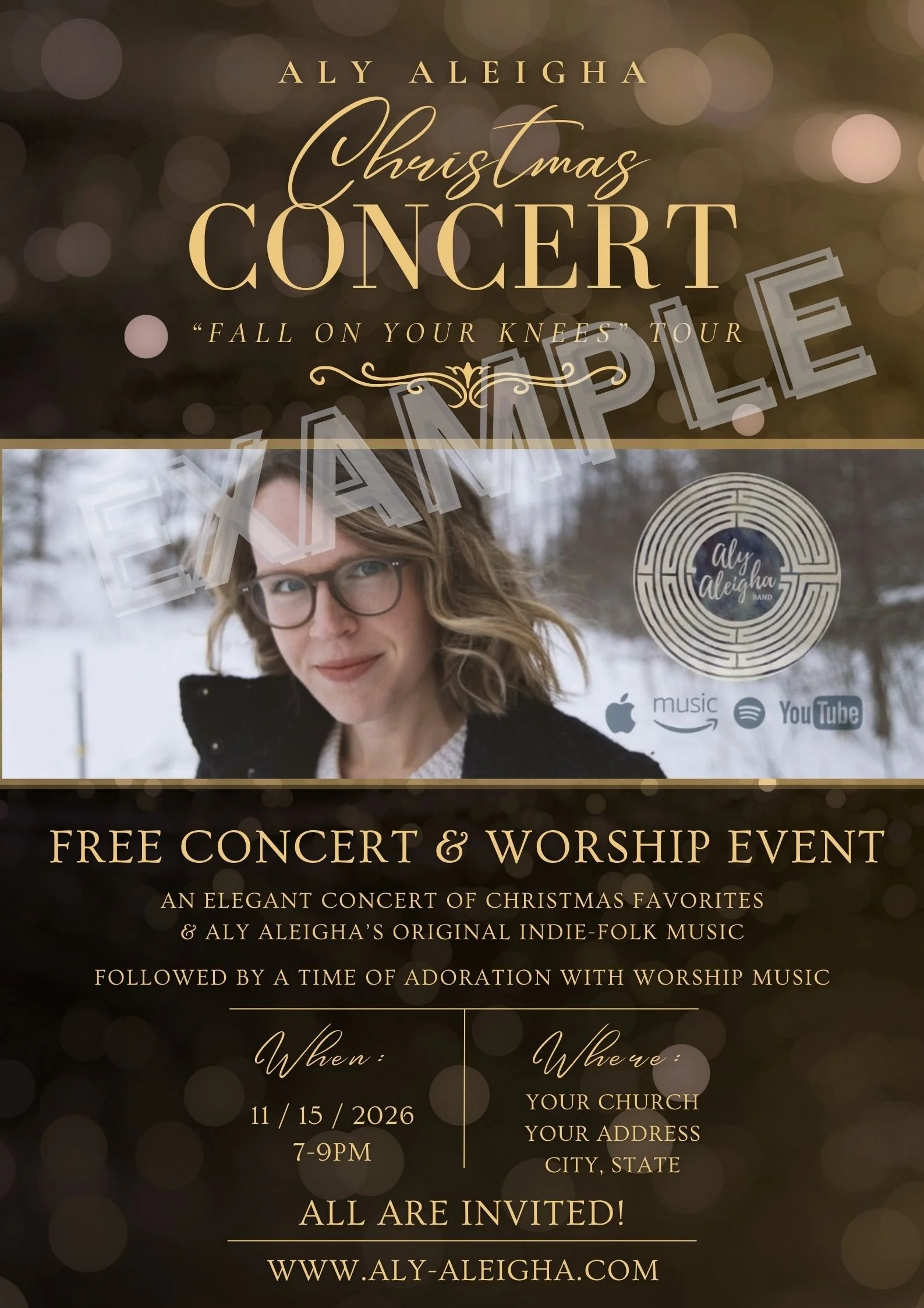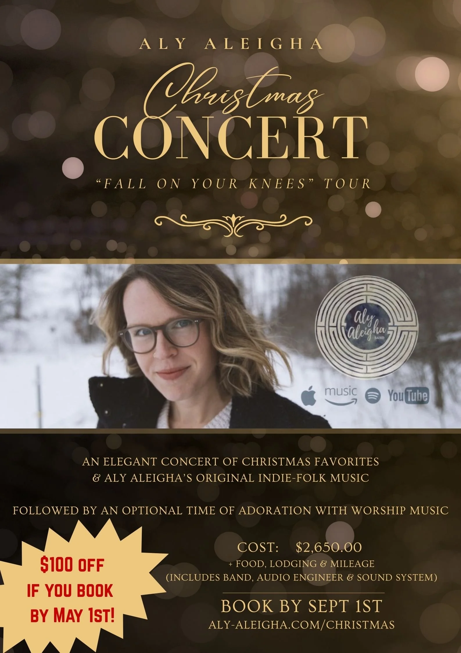 Join Aly Aleigha & her band for an elegant yuletide Concert to help prepare our hearts for Christmas! Be serenaded by familiar Christmas favorites with a classy indie-folk twist, along with some of Aly Aleigha’s original music inspired by her faith & adventures. This event will leave everyone with that special feeling of Christmas cheer, as well as help prepare our hearts for Christmas.